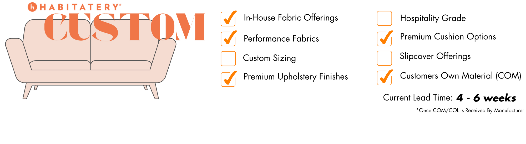 • FULL-CUSTOMIZATION, including COM-Upholstery + Dimensional and Material Alterations.